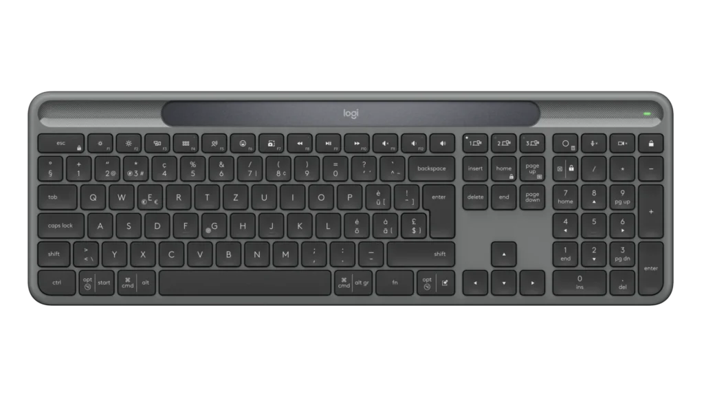 Sì, avete letto bene. La nuova Signature Slim Solar+ K980 nasce con l’obiettivo di eliminare del tutto il concetto di ricarica: qui non abbiamo cavi, pile stilo, porte d’ingresso. Niente. Solo una barra fotovoltaica integrata nella parte superiore che, grazie alla tecnologia Logi LightCharge, converte la luce solare o artificiale in energia sufficiente per garantirne il funzionamento.